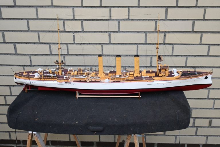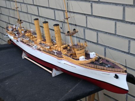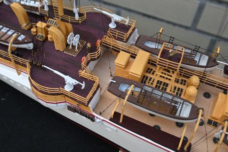 Das Schiff ist in Schichtbauweise hergestellt. Danach würden Funierleisten aufgesetzt. Bei diesem Modell habe ich alle Aufbauten selbst hergestellt, da die alten Holzteile zu porös waren. Ebenfalls wurde auch feinere Leisten verwendet.